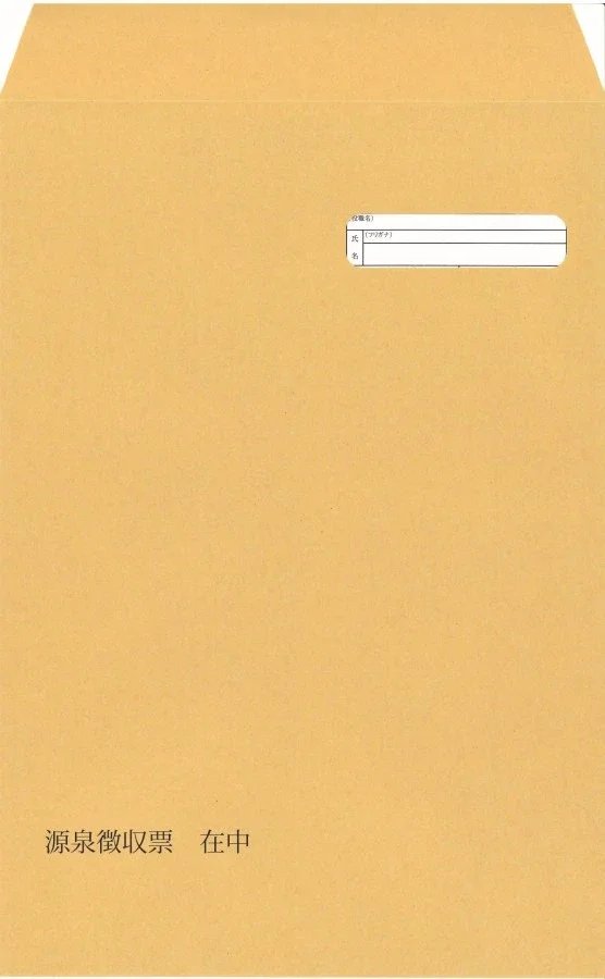源泉徴収票の役職と氏名欄部分に窓が付き、内容が確認できます。封筒内側には地紋がプリントされ、内容物が透けにくい構造になっています。