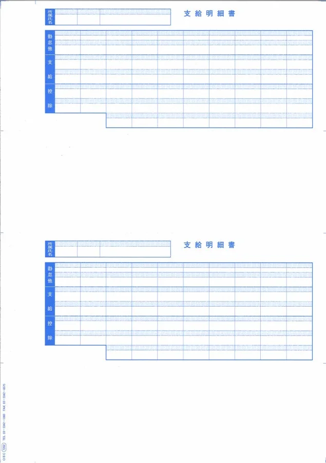 給与奉行クラウド専用の支給明細書です。レーザープリンタ用カット紙・単票となります。ミシン目が入っていますので切り離した後、