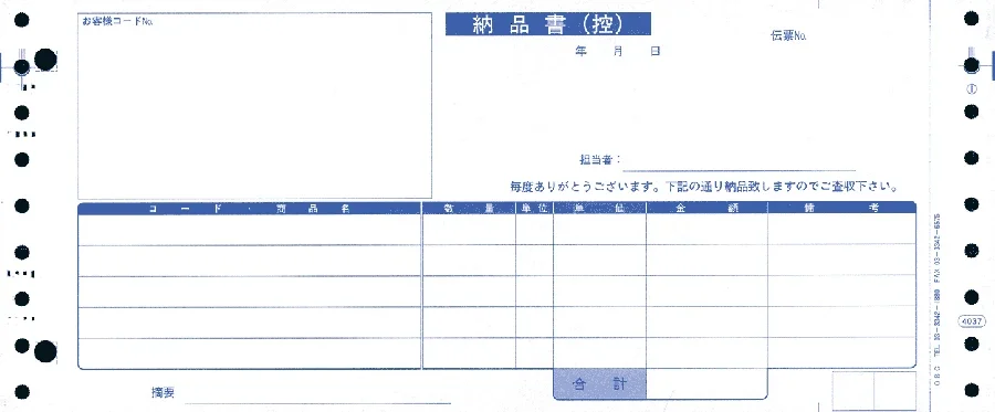 1片は4枚複写で、1枚目 納品書(控)、2枚目 請求書、3枚目 納品書、4枚目 物品受領書となっています。